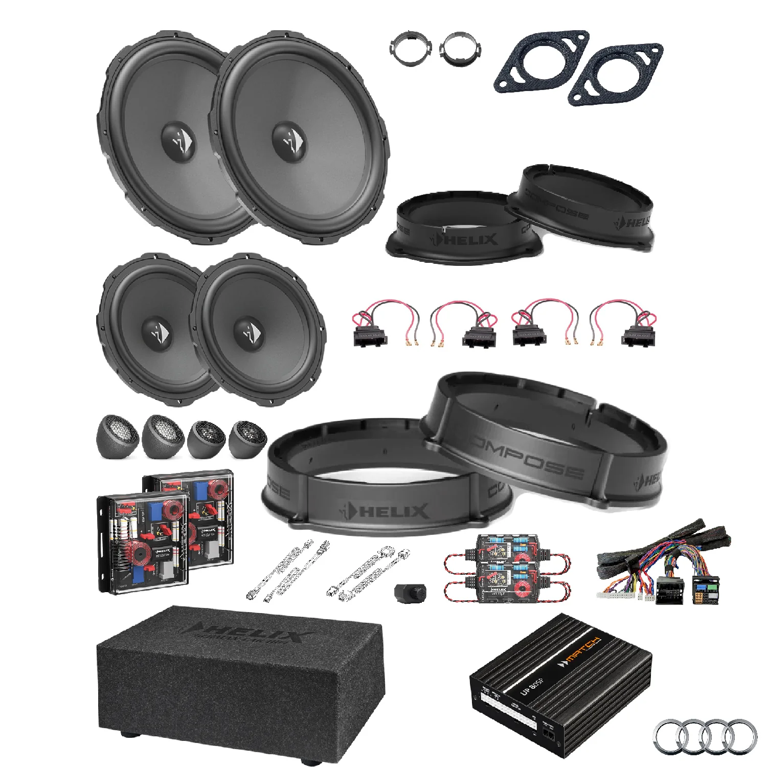 This tested bundle of selected items was created specifically to upgrade the car’s stereo using the HELIX COMPOSE system.