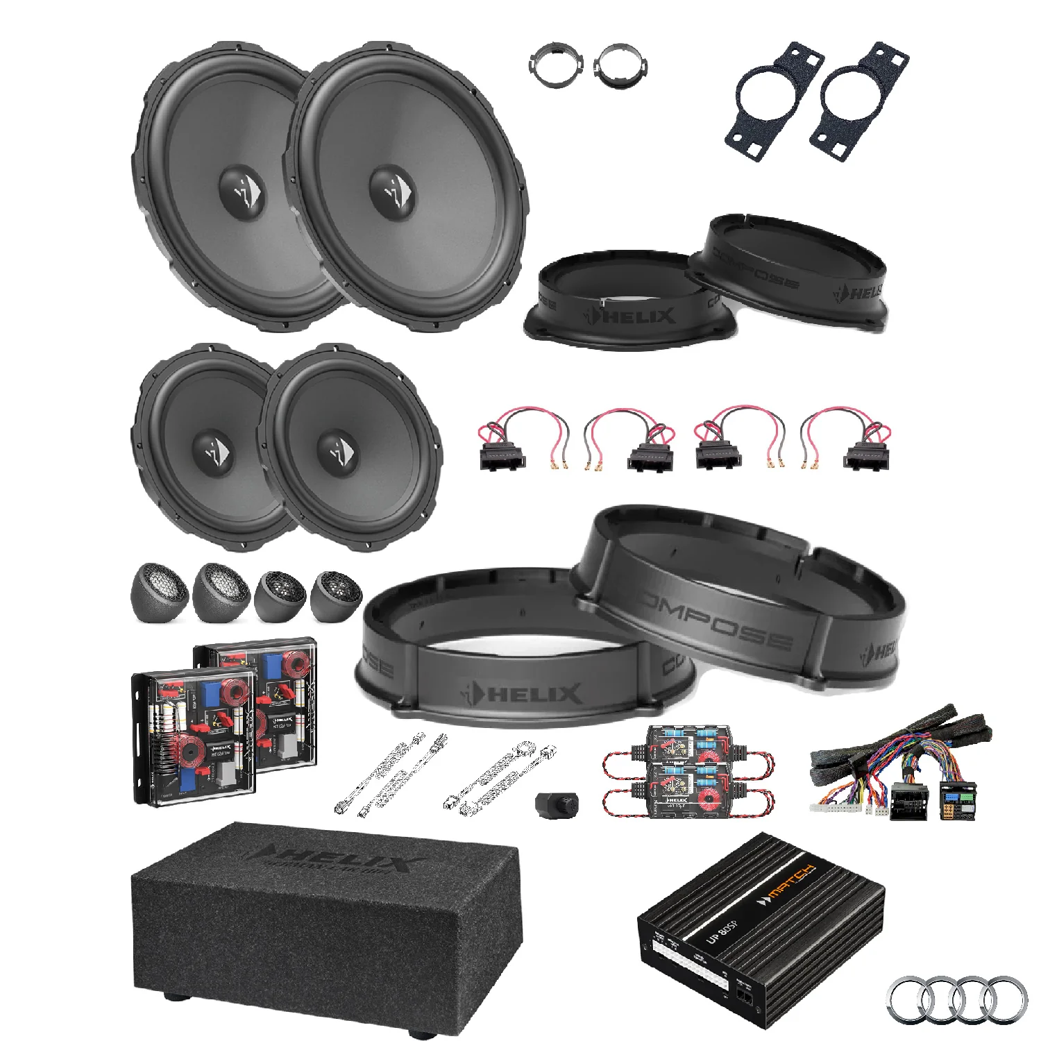 This tested bundle of selected items was created specifically to upgrade the car’s stereo using the HELIX COMPOSE system.