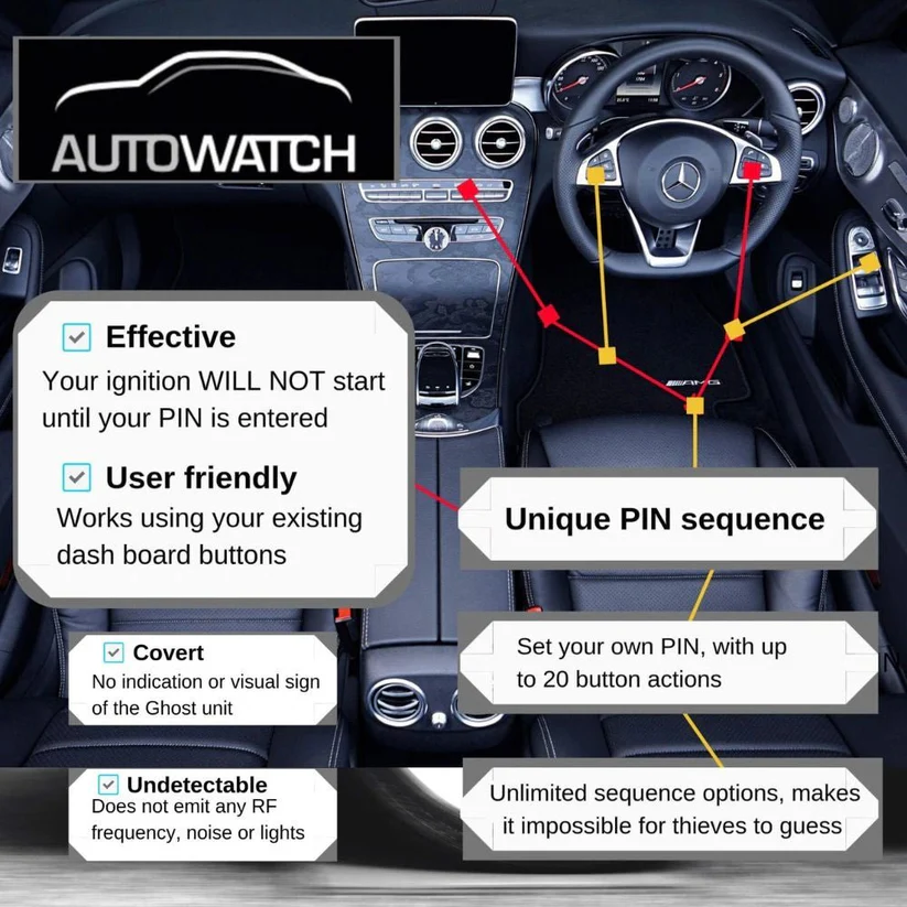 The Autowatch Ghost 2 Immobiliser is the ultimate vehicle security solution in the UK, designed to protect cars from theft methods such as key cloning, relay theft, and hacking. This advanced immobiliser prevents the engine from starting without a unique PIN code sequence, entered via your car’s existing dashboard or steering wheel buttons.